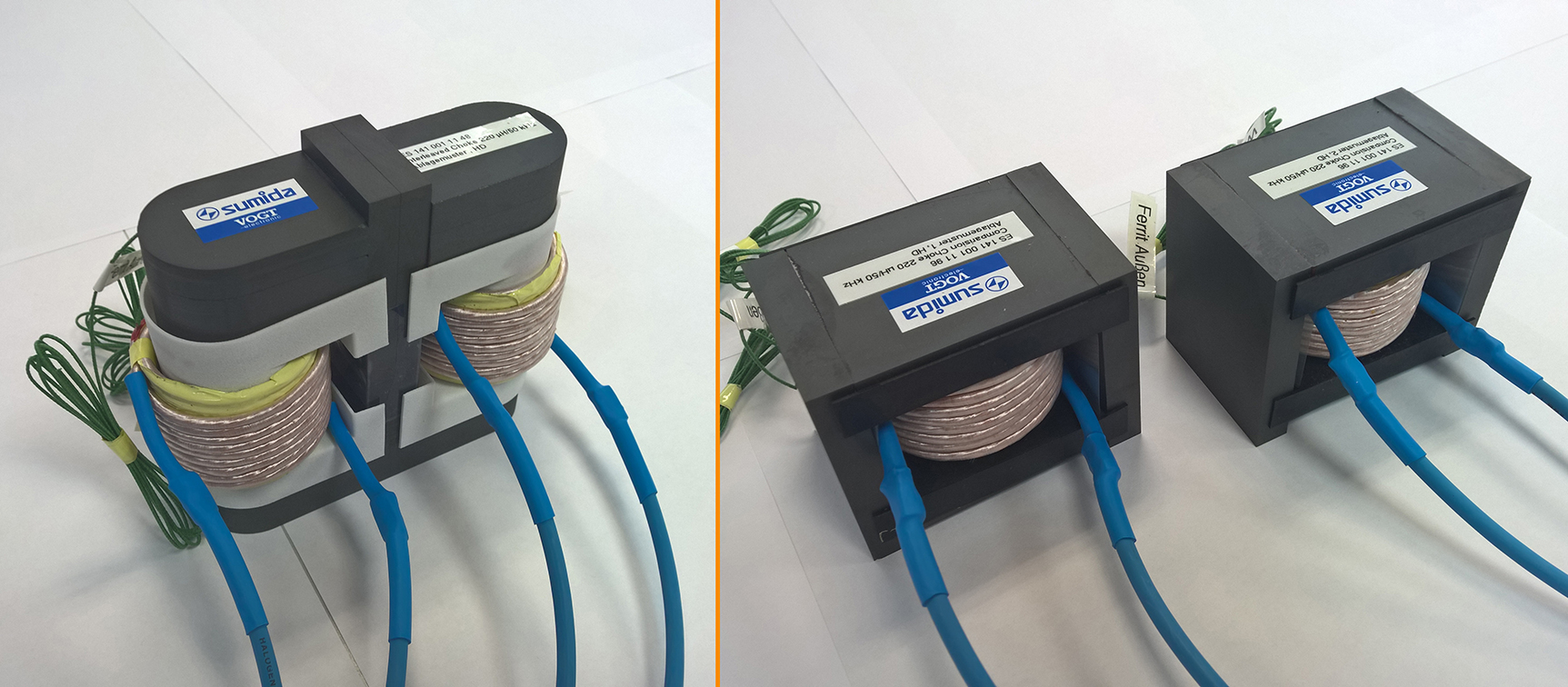 Die im Forschungsprojekt PV-LEO entwickelte interleaved Drossel (links im Bild) hat gegenüber zwei konventionellen Drosseln (rechts) erhebliche Vorteile: Das Volumen konnte um 28 Prozent, das Gewicht um 17,5 Prozent reduziert werd