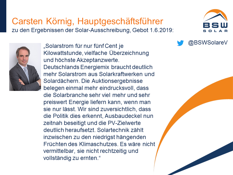 Carsten Körnig, Hauptgeschäftsführer des Bundesverbandes Solarwirtschaft e.V. zu den heute veröffentlichten Ergebnissen der Ausschreibung für Solaranlagen zum Gebotstermin 1. Juni 2019: