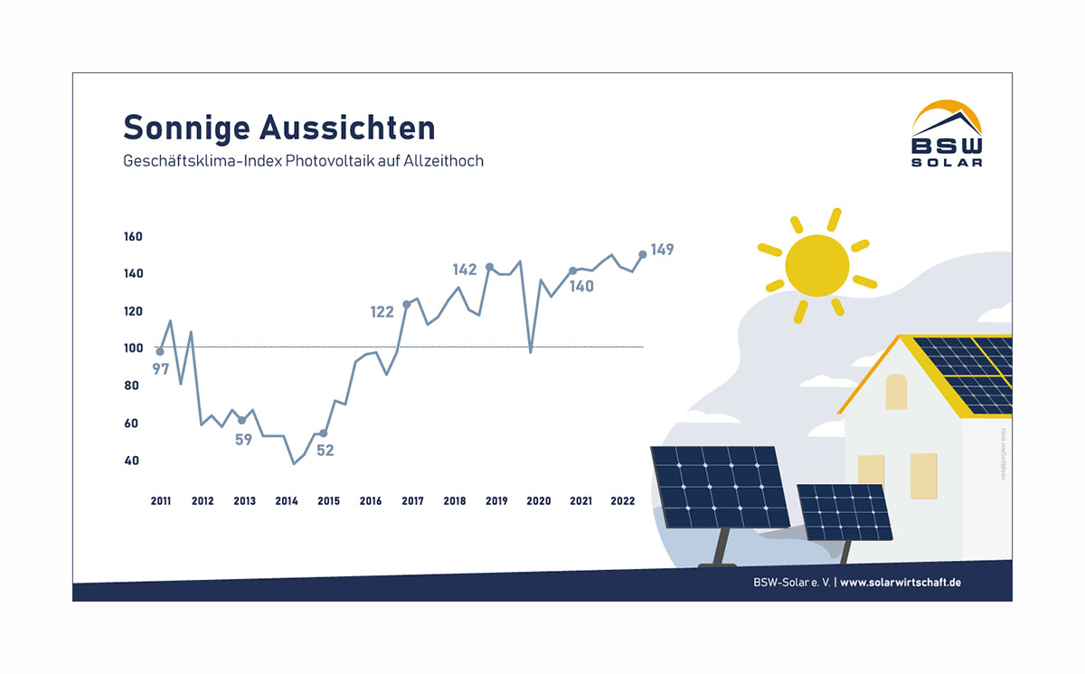 Der vom Bundesverband Solarwirtschaft e. V. mit Unterstützung der Intersolar Europe erhobene Geschäftsklimaindex (GKI) für die PV-Branche ist im 4. Quartal 2022 um 7,6 Punkte auf 149,0 Indexpunkte gestiegen. Dies stellt einen knappen Höchststand seit Beginn der Datenerfassung dar – denn im 1. Quartal 2022 hatte der GKI bereits einmal den Stand von 148,9 Indexpunkten erreicht. Im 4. Quartal 2022 steigt die Einschätzung der Geschäftserwartungen um 10,2 Punkte auf 146,3 Punkte und erreicht damit den Höchststand seit Beginn der Erfassung. Die Einschätzung der aktuellen Geschäftslage der PV-Unternehmen steigt um 4,8 Punkte auf 151,7 Punkte auf den zweithöchsten Wert seit Beginn der Datenerfassung.