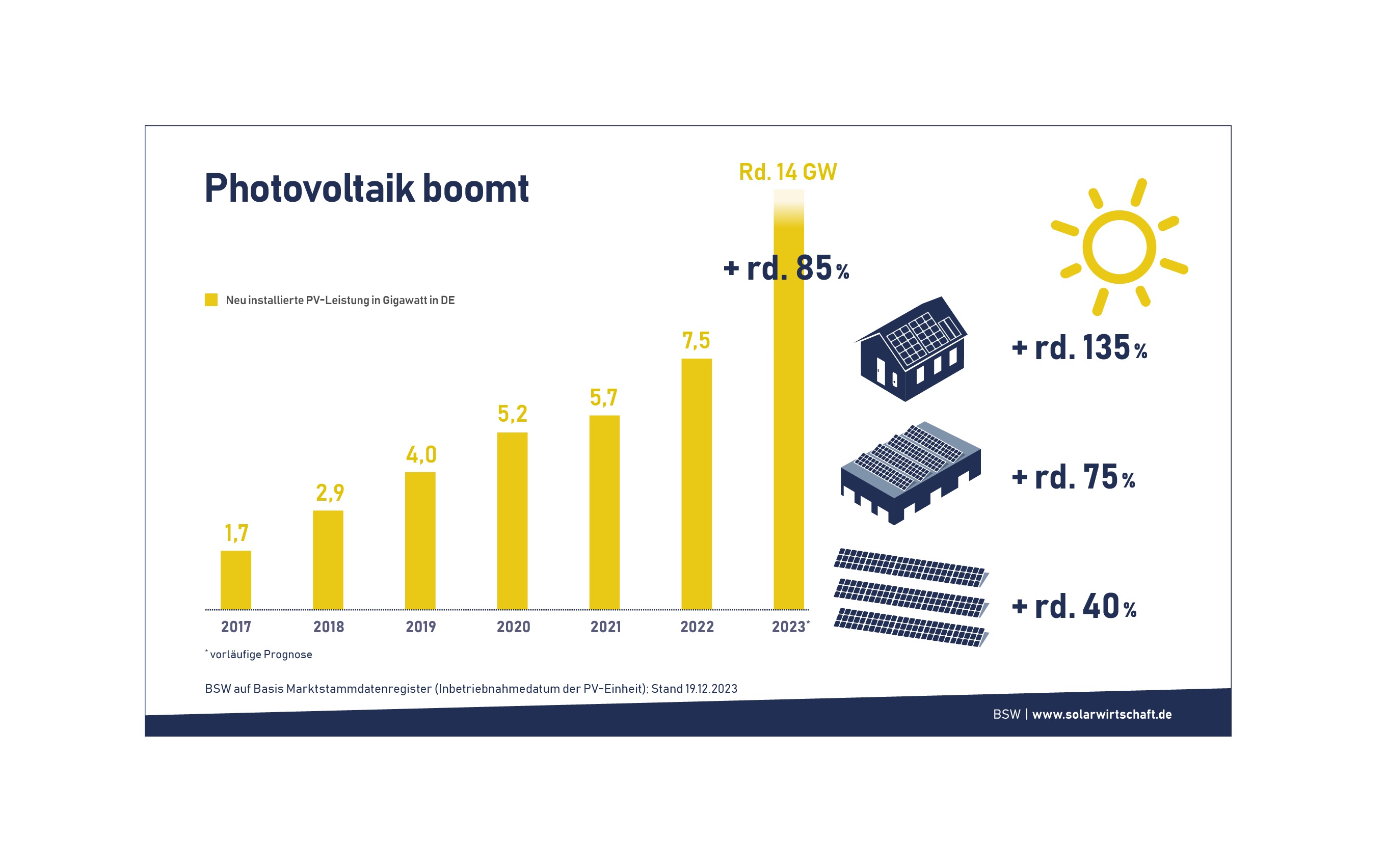 Nach Angaben des Bundesverbandes Solarwirtschaft (BSW) wurden im vergangenen Jahr in Deutschland mehr als eine Million neue Solaranlagen zur Strom- oder Wärmeerzeugung installiert, mehr als jemals zuvor. Aus Daten der Bundesnetzagentur geht hervor, dass allein Solarstromsysteme mit einer Spitzenleistung von rund 14 Gigawatt auf Dächern und Freiflächen neu in Betrieb genommen wurden. Das sind 85 Prozent mehr Photovoltaik-Leistung als im Vorjahr 2022 (rd. 7,5 GW). Für 2024 rechnet der Branchenverband mit einer anhaltend hohen Nachfrage. Er begründet dies mit weiter steigenden Strompreisen und attraktiven Förderkonditionen.