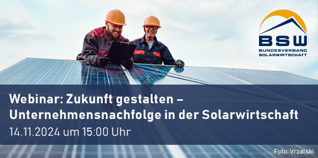 Der Bundesverband Solarwirtschaft bietet für alle Mitgliedsunternehmen ein kostenfreies Webinar zur Unternehmensnachfolge in der Solarwirtschaft an.