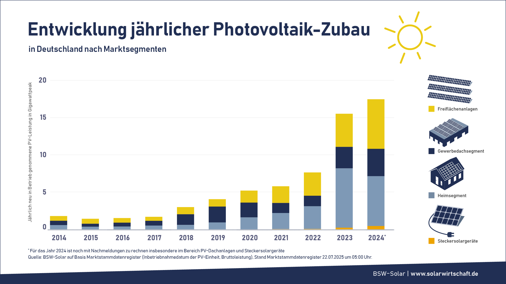 Die jährlich neu installierte Photovoltaik-Leistung in Deutschland hat sich im Jahr 2024 gegenüber dem Jahr 2021 verdreifacht.