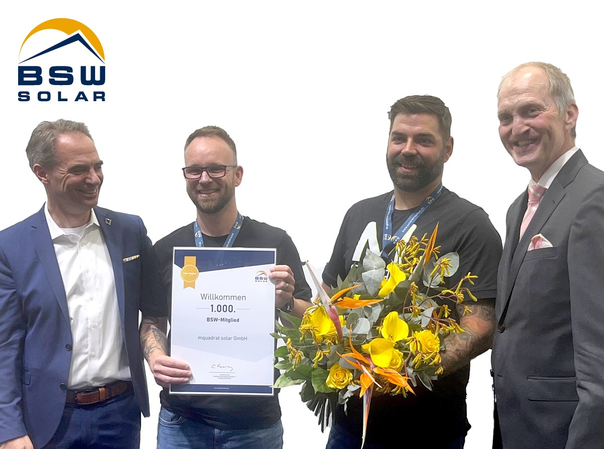 Feierliche Begrüßung des 1.000. BSW-Mitglieds mquadrat Solar GmbH durch Hauptgeschäftsführer Körnig (links) und Präsident Ebel (rechts).